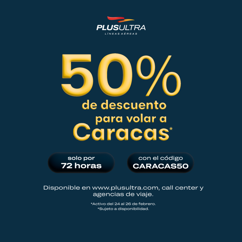 Plus Ultra Líneas Aéreas activa durante 72 horas su promoción del 50% para volar a Caracas